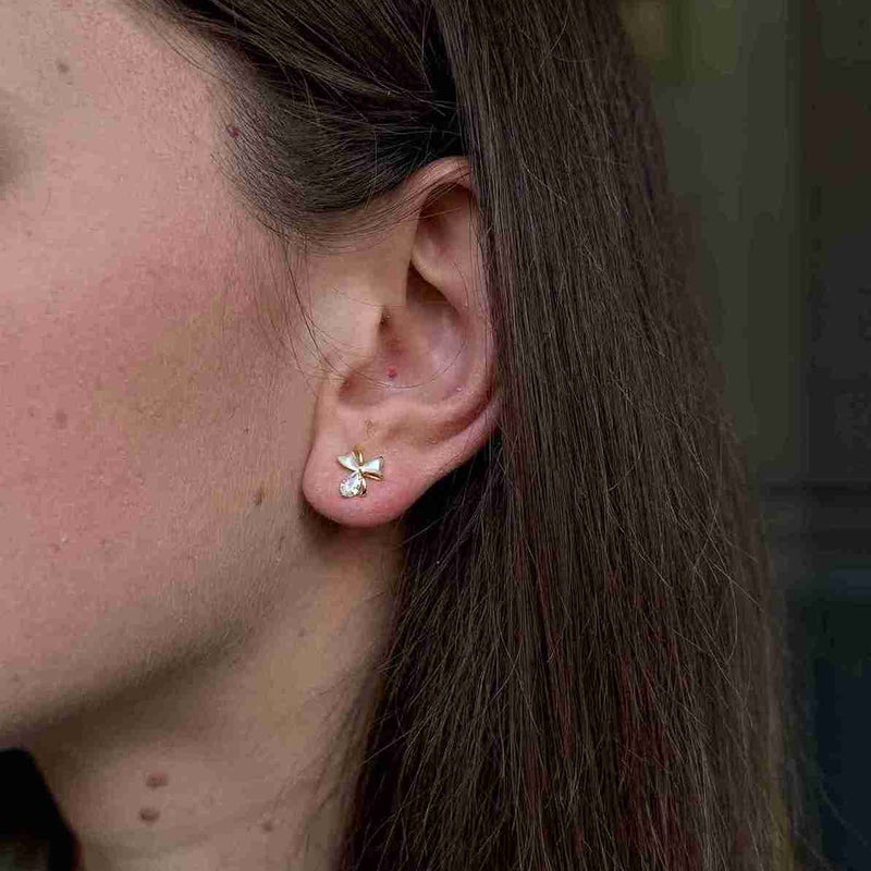 Mini bow studs with glossy white enamel and a sparkling 6mm CZ stone—eye-catching enough to feel occasion-ready, yet small and lightweight for daily comfort. Crafted in S925 sterling silver with 14K gold vermeil. A polished go-to for workdays, dinners, and bridal events, plus effortless gifting for anniversaries and celebrations.